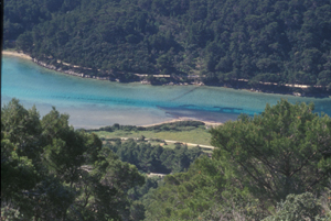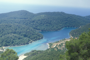 S ovog mjesta pruža se pogled prema naselju Soline i Velikom mostu, gdje su u prošlosti stajali kameni most i mlinica na plimu i oseku. Postavljen je na mjestu koje je izravno izloženo južnom vjetru. Vegetacija je tu polegla prilagođena snažnim udarima mora i vjetra. Na stjenama možemo vidjeti izrazite halofite, biljke prilagođene utjecaju mora. Mlinica i most na ulazu u Veliko jezero nisu točno datirani, ali pretpostavlja se da je mlinica iz 16. st., tj. iz vremena kada je obnovljen samostan i crkva Sv. Marije. Opis takve jedinstvene mlinice na Jadranu, koju je pokretala plima i oseka, nalazimo kod F. Vrančića "Machinae novae":